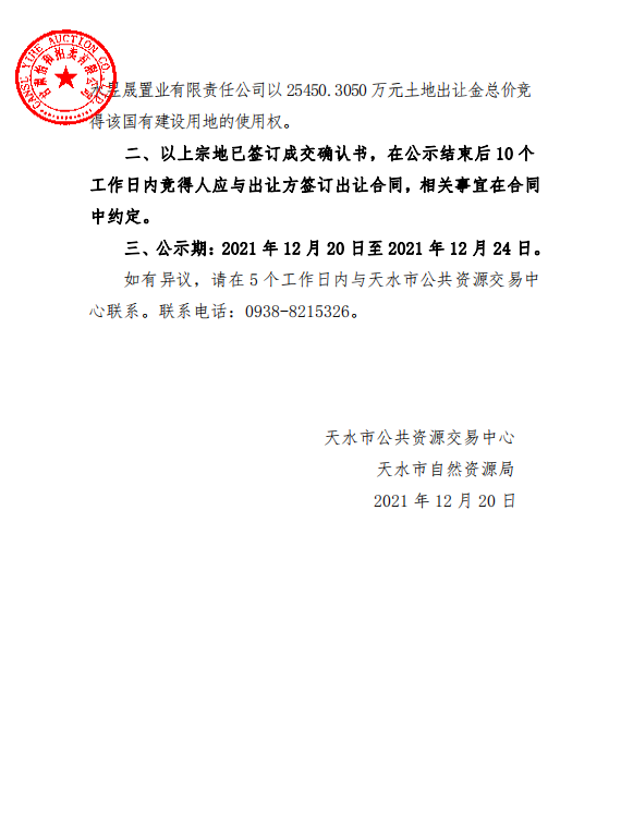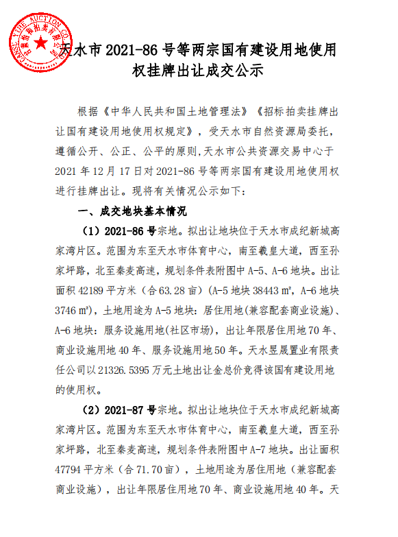 天水昱晟置业有限责任公司以21326.5395 万元土地出让金总价竞得该国有建设用地的使用权。