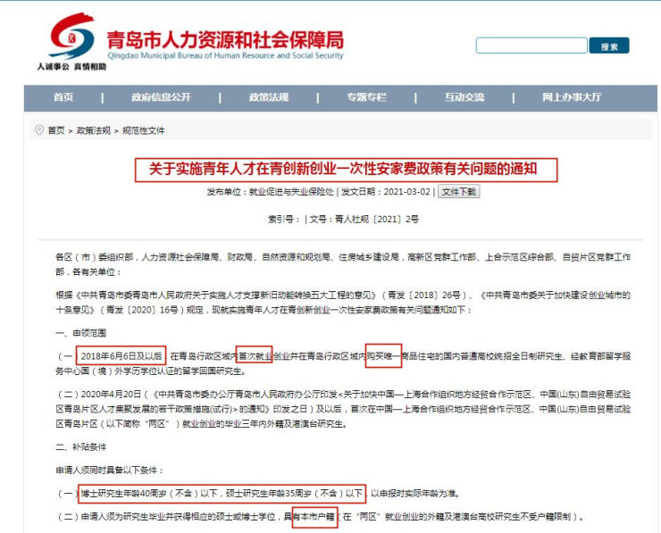 但政策并非面对所有新青岛人。青岛市人力资源和社会保障局3月份发布了一次性安家费的较新政策,它面向的是2018年6月6日及以后,在青岛行政区域内首次就业创业并在青岛行政区域内购买少有商品住宅的国内普通高校统招全日制研究生、经教育部留学服务中心国(境)外学历认证的留学回国研究生,或2020年4月20日及以后,首次在中国—上海合作组织地方经贸合作示范区、中国(山东)自由贸易试验区青岛片区(以下简称“两区”)就业创业的毕业三年内外籍及港澳台研究生。同时,对年龄、户籍等方面有要求。