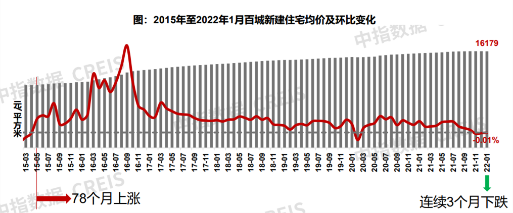 根据中指研究院数据,2022年1月,百城新建住宅均价16179元/平方米,环比继续下跌,跌幅为0.01%,同比上涨2.06%;二手房方面,1月百城二手住宅均价15987元/平方米,环比跌幅收窄至0.08%,同比上涨2.86%。