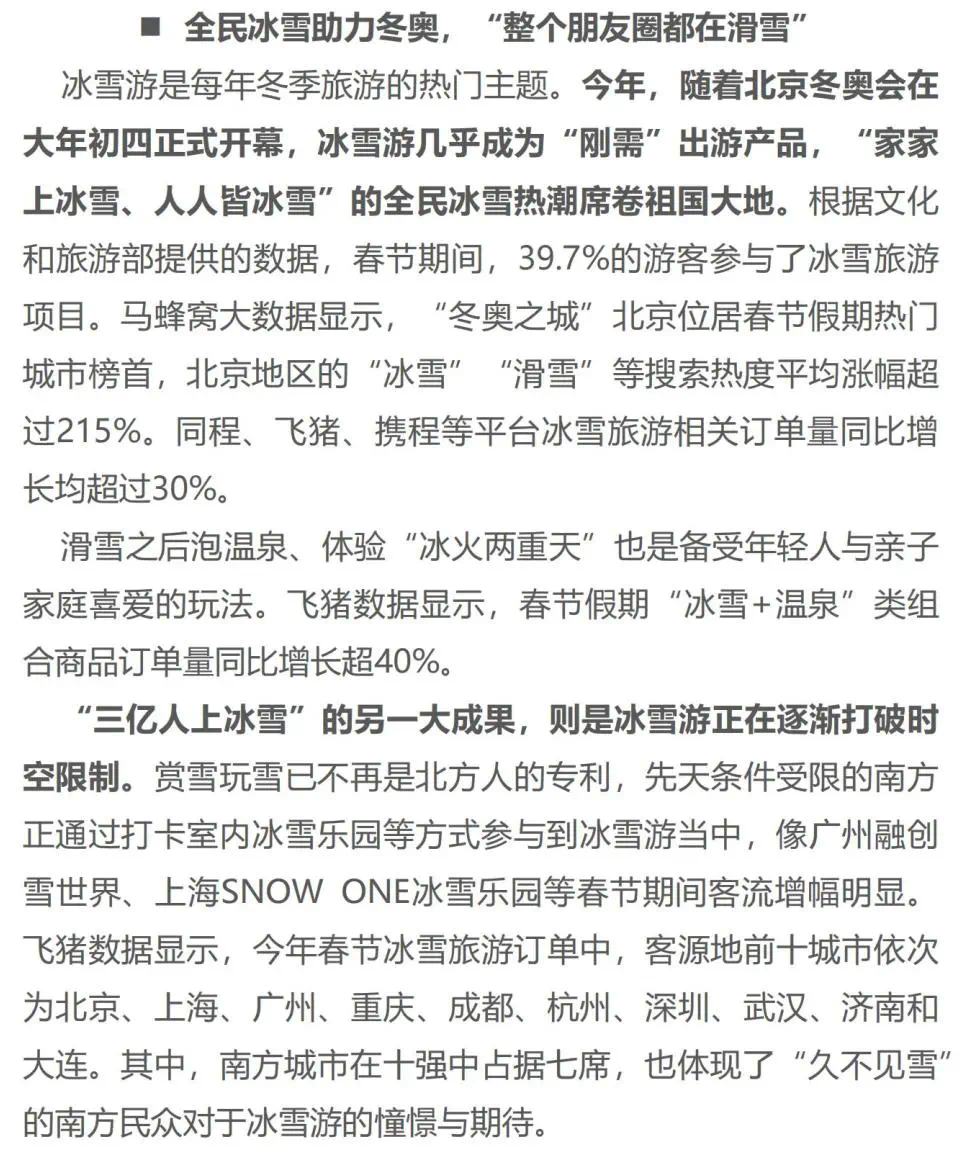 春节假期已经正式落下帷幕。根据文化和旅游部数据中心测算,2022年春节假期七天,全国国内旅游出游2.51亿人次,同比减少2.0%,恢复至2019年同期的73.9%;实现国内旅游收入2891.98亿元,同比减少3.9%,恢复至2019年同期的56.3%。今年春节假期,在就地过年的倡导下,周边游、省内游继续高度活跃,旅游需求就近释放效应明显,赏雪景、品民俗、住民宿成为较受欢迎的出游与娱乐方式。