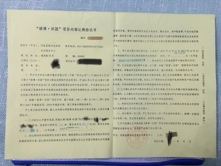“从2013年排名前列次交房款开始,到现在已经8年了。我们先后分了6次付款,总共缴纳了70多万元房款,认购协议约定2018年底前交房,但直到现在也没有交房。郁闷的是,现在房子盖好了,开发商却要求涨价,从原先的每平方米5700元涨到7900元,才给交钥匙!”作为河南省煤田地质局一名职工,张女士向记者反映了其购买单位“团购房”郑州亚太绿博田园的遭遇。