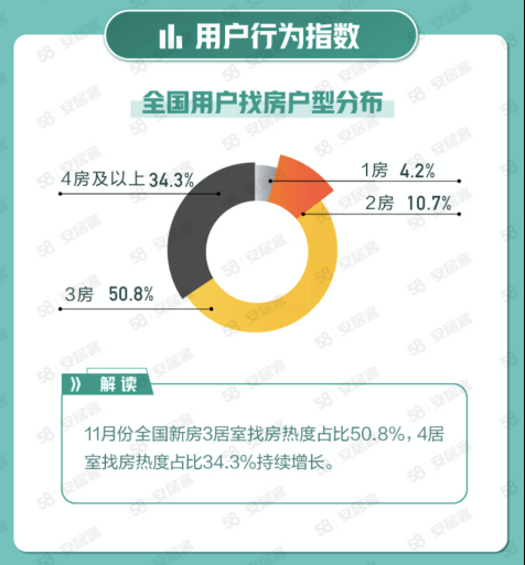 据58同城、安居客近日发布的2021年《11月国民安居指数报告》,11月全国重点监测65城新房在线均价17415元/㎡,环比微跌0.27%,购房者信心指数环比上涨3.4%。在户型选择上,高达50.8%的用户在找3房。