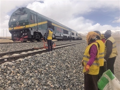 “格(尔木)方无车,拉(萨)方无车,可以上道”,进行安全检查后,旦增桑珠带着十数个工人上轨作业。为了御寒、预防能烧焦皮肤的紫外线,他们一年四季穿着棉袄,戴着脖套和帽子,只露出眼睛。