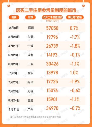 值得关注的是,目前落实二手住房参考价制度的10个城市中,有8个城市挂牌价环比下降,分别为东莞、宁波、成都、三亚、绍兴、无锡、合肥和广州。