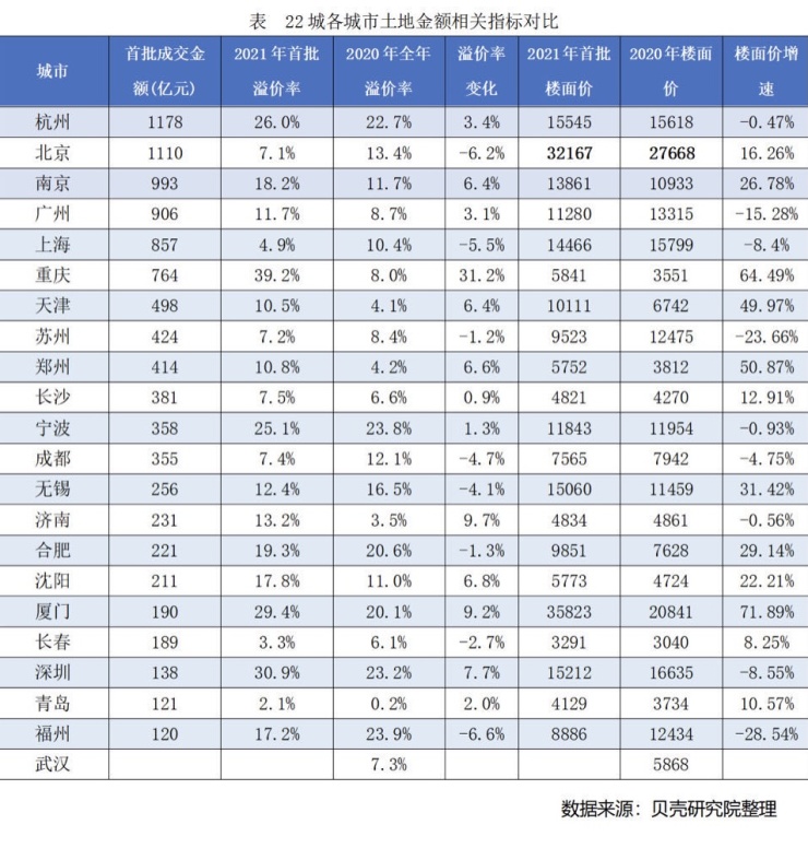 贝壳研究院数据也显示,北京、南京、重庆、天津今年首批供地楼面价上涨,较2020年楼面价增幅分别为16.26%、26.78%、64.49%、49.97%。不过,杭州、广州、上海楼面价较去年有所下降,其中广州降幅达15.28%。