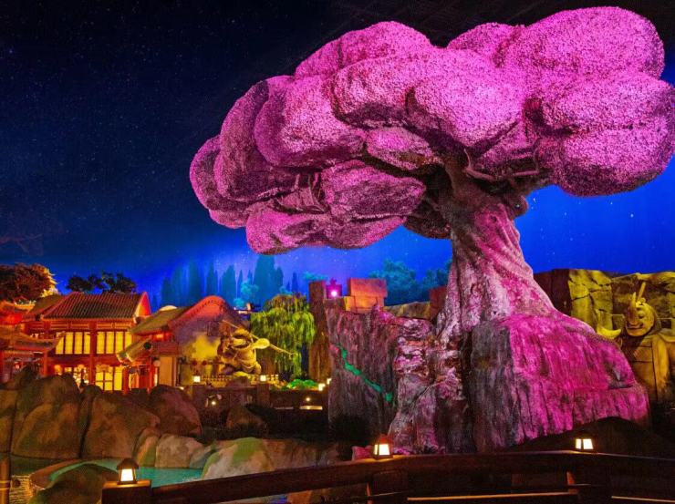 步入功夫熊猫盖世之地主题景区,仿佛闯进一个梦幻的东方仙境。这里全部是室内景区,冬暖夏凉,在园区玩累了,不妨到这里歇一歇,漫步其中,享受美食小吃,还可以静静欣赏灯光秀。在熊猫阿宝生活的和平山谷,有小桥流水、翡翠宫、熊猫村,大大小小的彩灯遍布其中。最醒目的是一棵高达10米的智慧仙桃树,据说树上有58000朵花瓣,全部由艺术家们手工制作,在灯光下栩栩如生,还随着季节更替不断转换。