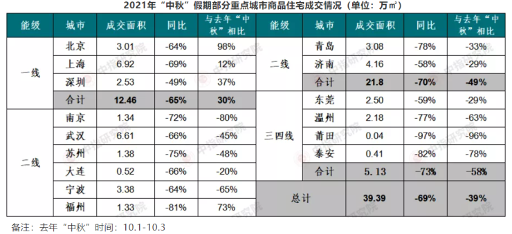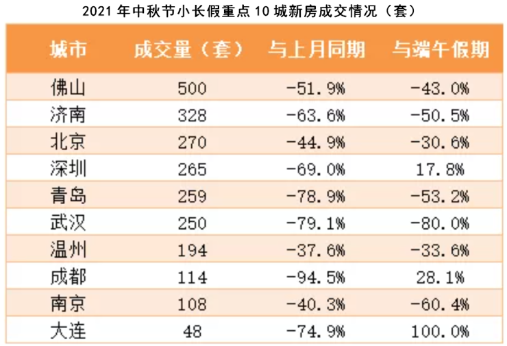 诸葛找房数据研究中心数据显示,中秋节假期北京、深圳等重点10城新房成交2336套,较8月同期下跌72.4%,较去年中秋同期下降82.1%,较2019年中秋假期下跌40.1%,较2018年中秋假期下跌36.9%。