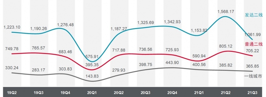 结合24城季度成交量来看,三季度各线城市月均成交量均环比回落。其中一线城市回落幅度较小。发达及普通二线城市成交量分别环比下降32.3%和12.4%,表明二线城市特别是发达二线城市需求放缓。随着四季度供应端改善及部分房企促销活动,该部分需求有望对市场成交规模提供支撑。预计在基本面较好、供应充足的城市四季度市场规模具备释放空间。