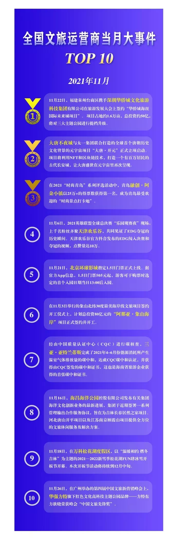 本月,各文旅运营商们延续了10月以来在逆势中迭代进化、破旧立新的表现,在年关将近之际依然保持着进取欲与探索力。其中,既有对于新项目的探索,如异地扩张的“阿那亚·象山海岸”,亦有对于新概念、新热点的探索,如开创排名前列“大唐元宇宙”的大唐不夜城以及将欢乐文化与电竞文化融为一体的天津欢乐谷。基于此,本月我们将重点解读具有自我革新力的文旅运营商,试图探究其如何在不同领域突破自我、锐意革新。