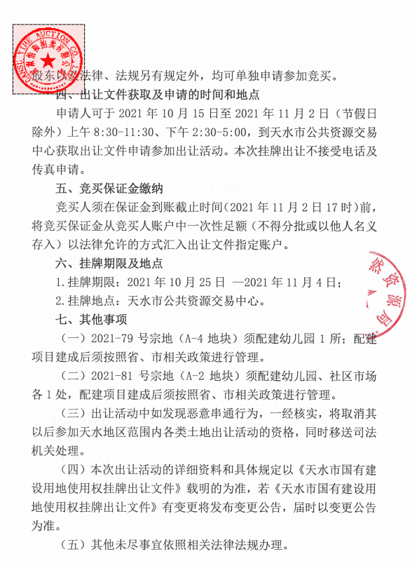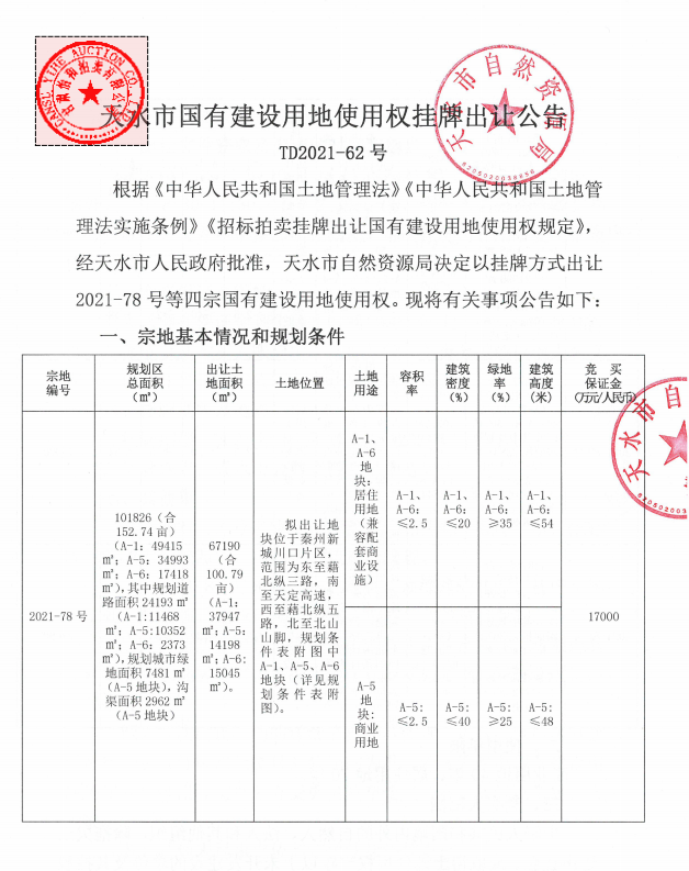 12月28日,天水市公共资源交易中心“招标/资格预审公告”栏发布一则关于“天水市2021-78号等四宗国有建设用地使用权挂牌出让”的公告。