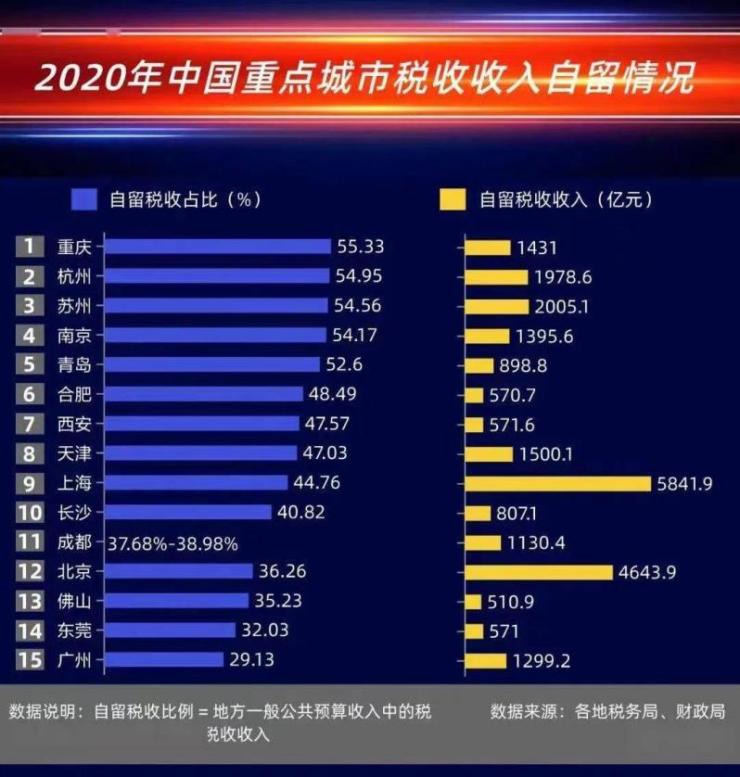 单就税收而言,广州自留比例不到3成,在主要城市里垫底,而重庆、杭州、苏州、南京、青岛等均超50%。