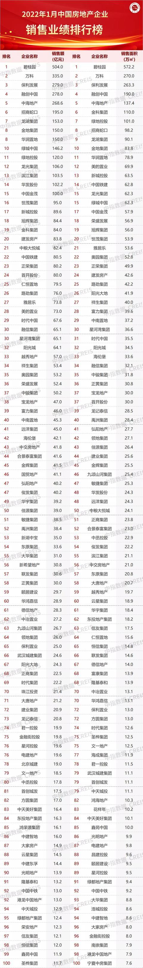 2022年1月中国房地产企业销售业绩排行榜