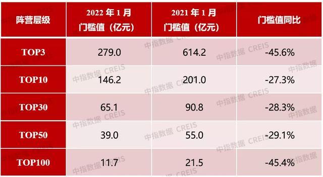 2022年1月,TOP100门槛值为11.7亿元。其中,TOP3房企门槛值为279.0亿元,较上年下降45.6%;TOP10房企门槛值为146.2亿元,较上年下降27.3%;TOP30房企门槛值为65.1亿元,较上年下降28.3%;TOP50房企及TOP100房企门槛值分别为39.0亿元和11.7亿元,同比分别下降29.1%和45.4%。