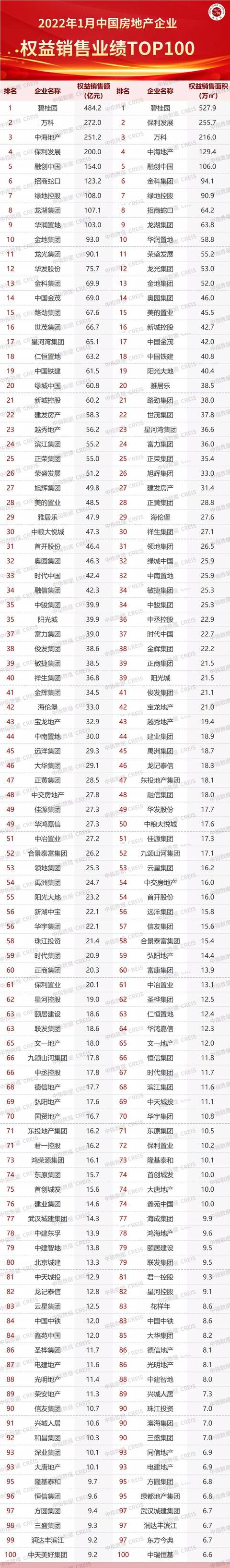特别声明:房地产企业权益销售数据统计是以2022年1月1日-1月30日期间按股权比例销售的商品房为统计口径,主要依据中指数据CREIS在各地的销售监测数据,并参考当期总体经营情况和推盘去化情况进行分析统计;对于少数没有在监测范围内的城市或项目,由企业提供相关证明文件,经课题组对数据进行严格审核,也纳入统计范围。本报告仅供参考,课题组不对使用报告及其内容所引发的任何直接或间接损失承担责任。