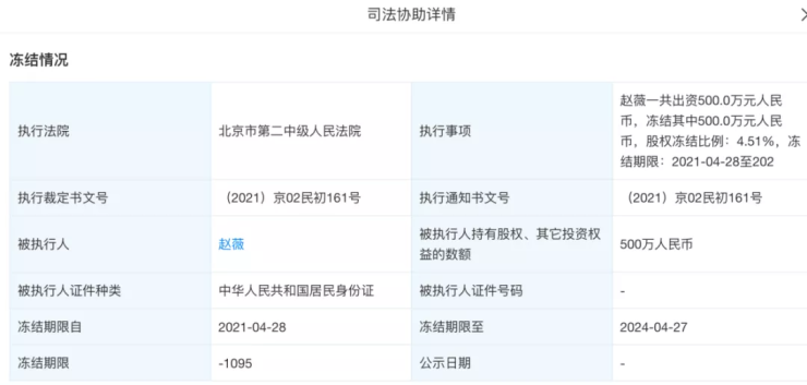 这还不算,赵薇手上另有有6家企业的股权已于今年4月被冻结,合计1862.6万元。