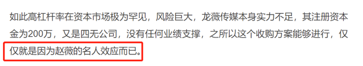 就这演技,真的值208万一天?更别说片酬只是明星们收入很小的一头。就拿赵薇来说,她与丈夫黄有龙的龙薇传媒,曾在仅有6000万资金的情况下,企图通过借贷以将近51倍的杠杆收购“万家文化”已发行股份的29.135%。当年的龙薇,注册资本仅200万还没实缴到位,未开展任何实际经营活动,总资产、净资产、营业收入和净利润都是零。这样的情况下,正常人都没有野心考虑30个亿的收购案吧?赵薇就敢,真不愧是在“皇阿玛”身边见过大世面的。她凭啥有这样的底气?谁给了她这么大的个人信用?还不都是明星光环的附加价值!