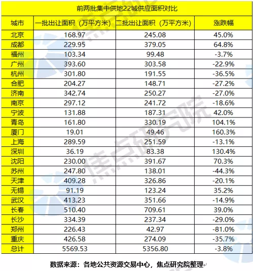 第二批22城集中供地成交地块的出让面积和计容建筑面积分别为3286.02万平方米和7113.76万平方米,出让金总额为6423.9亿元,较排名前列批次分别下滑36%、36%和40%,二批次出让面积和出让金额的下滑主要原因是多城地块频繁流拍和取消交易。