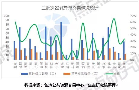 从具体城市方面来说,由于一轮土拍热度过高,房企抢地和地块达到较高限价成交的事件频发,政府对于第二批土拍普遍多设置较高的竞买门槛,这种现象在北京、长沙、广州和杭州等土拍热门城市的竞拍过程中表现明显,三城市异常交易的地块比例分别达到61%、52%和55%。而对于沈阳和长春,两个城市所处的东北房地产市场本身热度不高,尽管在出让政策等方面未有大的改变,但是地块异常交易的比例仍旧较高,分别达到59%和35%。