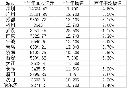 深圳和广州之后,来自西南的成都继续位居副省级城市第三位。数据显示,成都上半年实现GDP9602.72亿元,同比增长13.1%,两年平均增长6.7%。其中,上半年成都市规模以上工业增加值同比增长14.0%,两年平均增长8.0%,两年平均增速较一季度提高0.6个百分点。